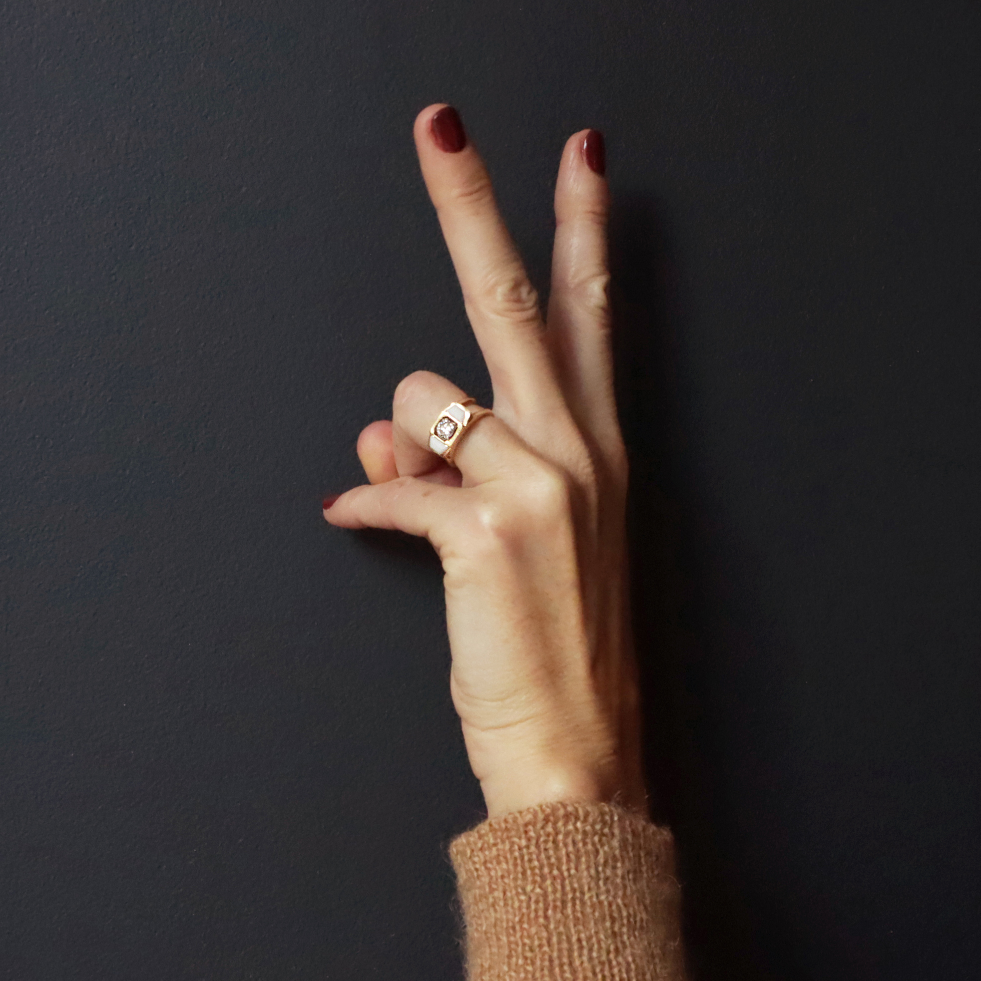 Initialement un solitaire en or blanc avec un diamant serti, elle réfléchit à le faire évoluer sans pour autant le dénaturer. Lui vient alors l’idée de créer un habillage qui embellirait la bague. Un système ingénieux qui lui a permis d’apporter un nouveau regard sur un souvenir vieux de vingt ans, comme une histoire qui ne cesse de s’écrire au fil des années sans perdre son souffle d’origine.