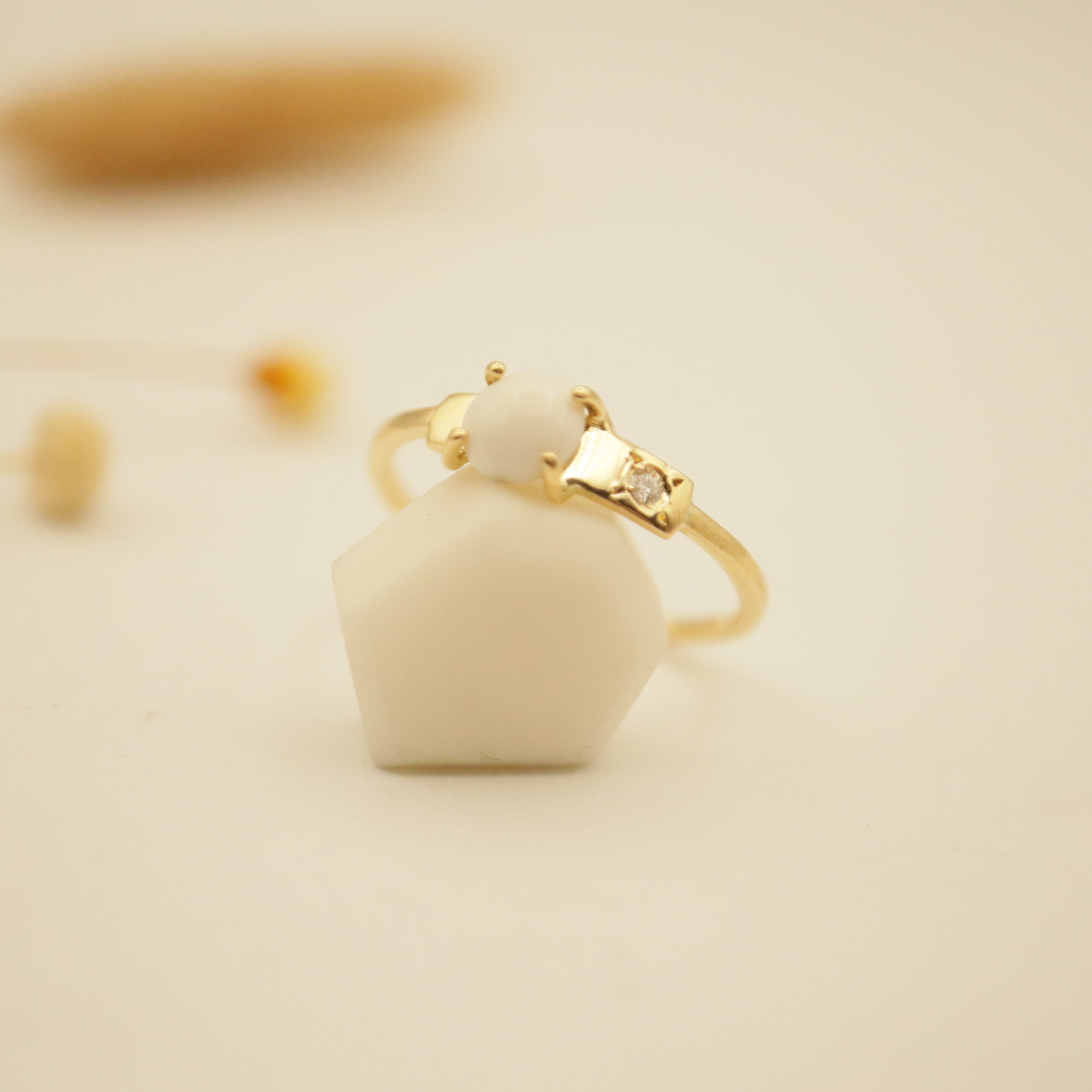 Bague avec une porcelaine biscuit mate, sertie sur une plaque en or 18 carats, 750/1000 et un petit diamant.