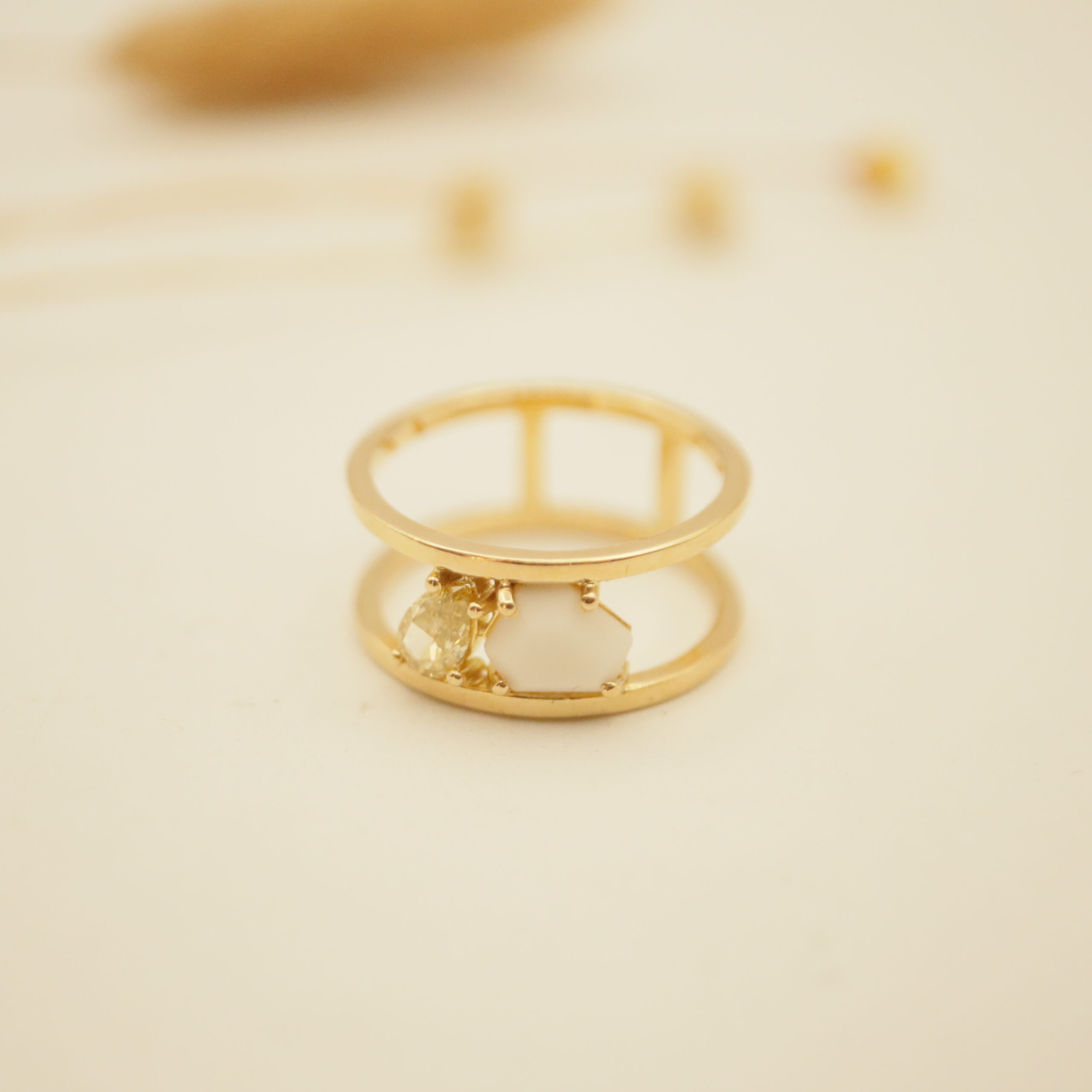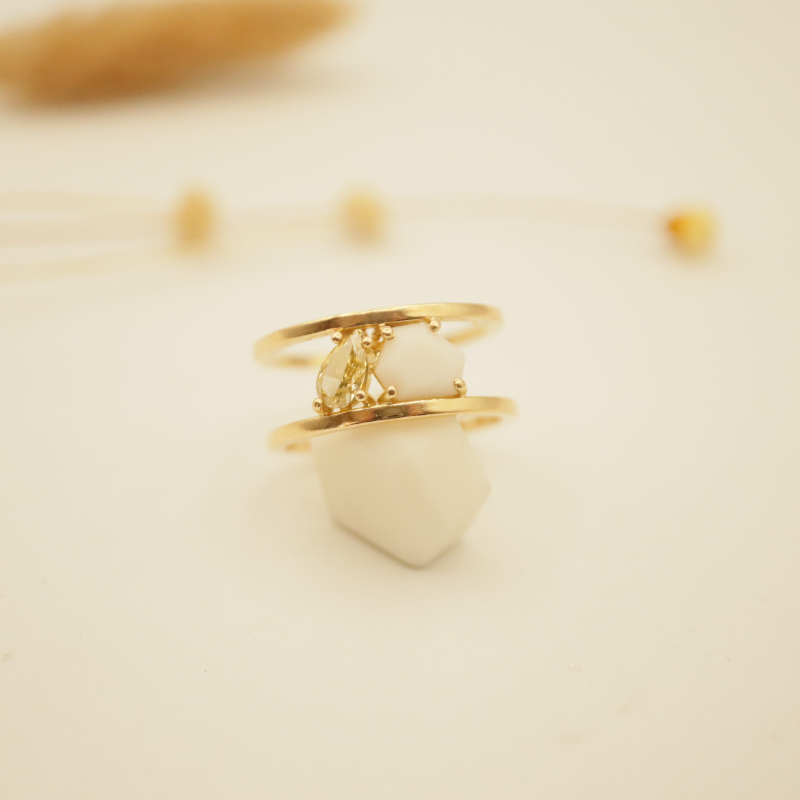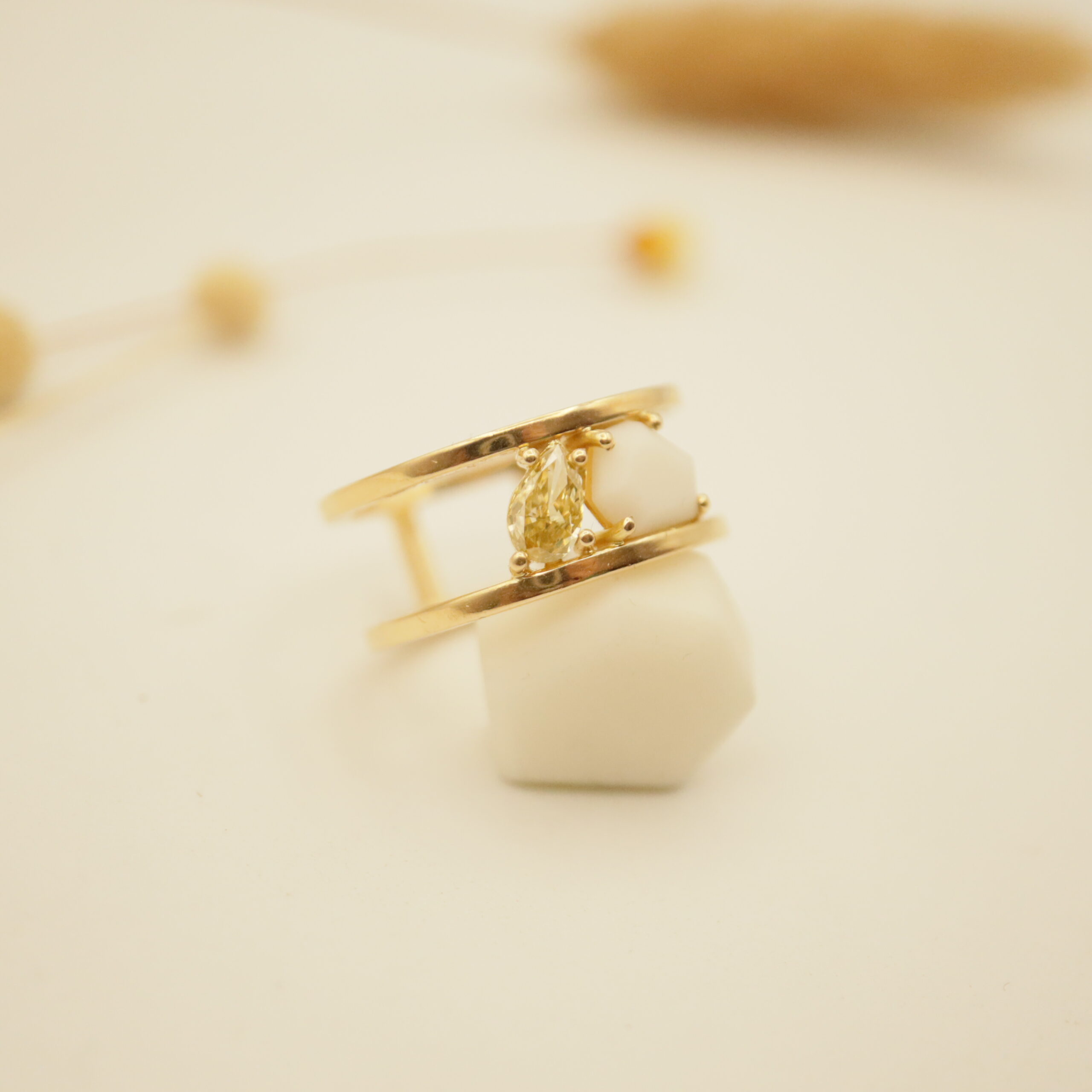 Bague or jaune 18 carats, 750/1000 avec une porcelaine biscuit sertie et un diamant poire de couleur jaune de 5,5×3,5 mm.