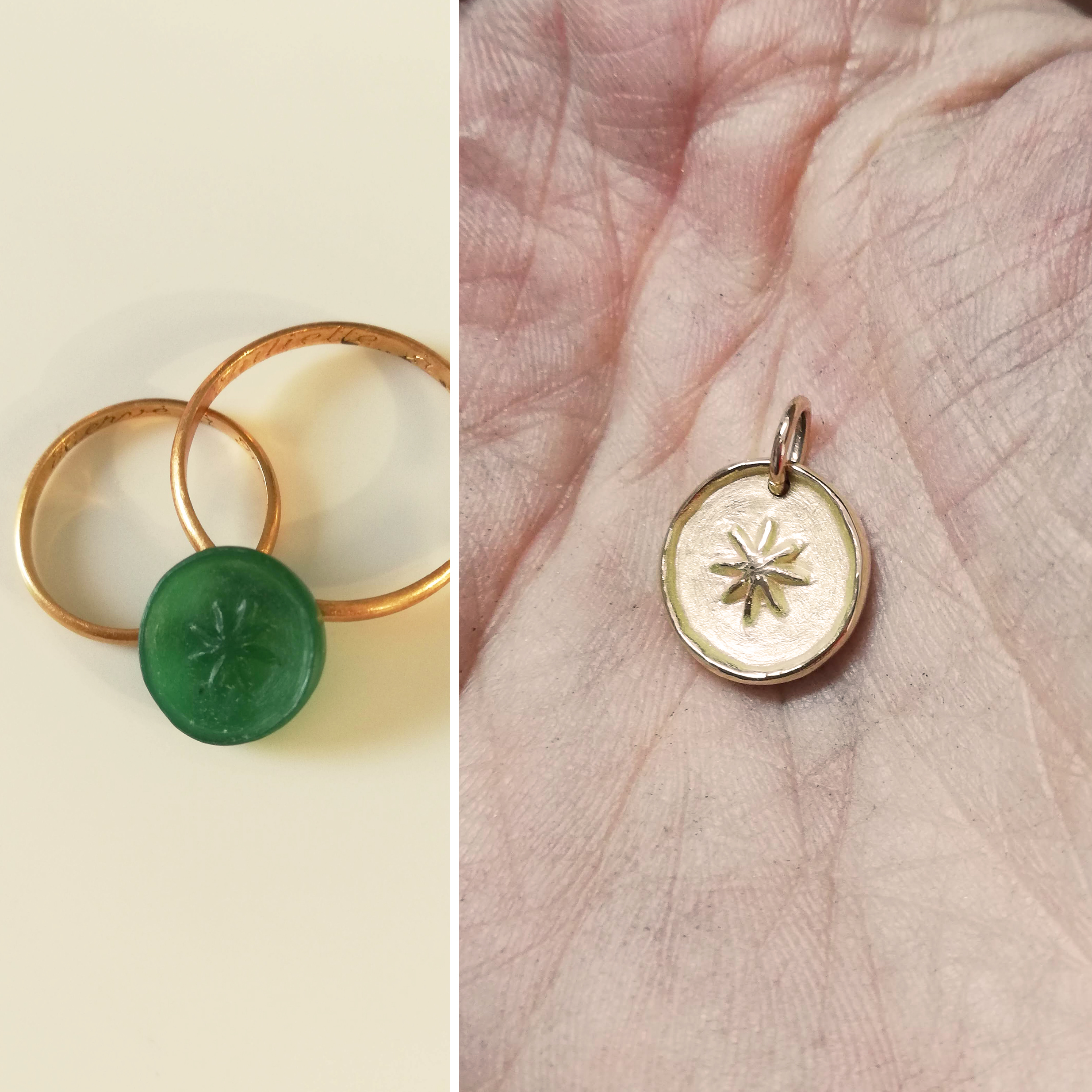 Suite à son divorce, une cliente souhaitait fondre son alliance ainsi que celle de son ex conjoint afin de créer un pendentif qu’elle offrira à sa fille pour une occasion spéciale. Finalement, la séparation des deux amants trouvent son compte dans l’union de leurs alliances en présent pour leur enfant. Une anecdote aux allures négatives pour un nouveau bijou avec son motif étoile qui guidera l’enfant née d’un amour !